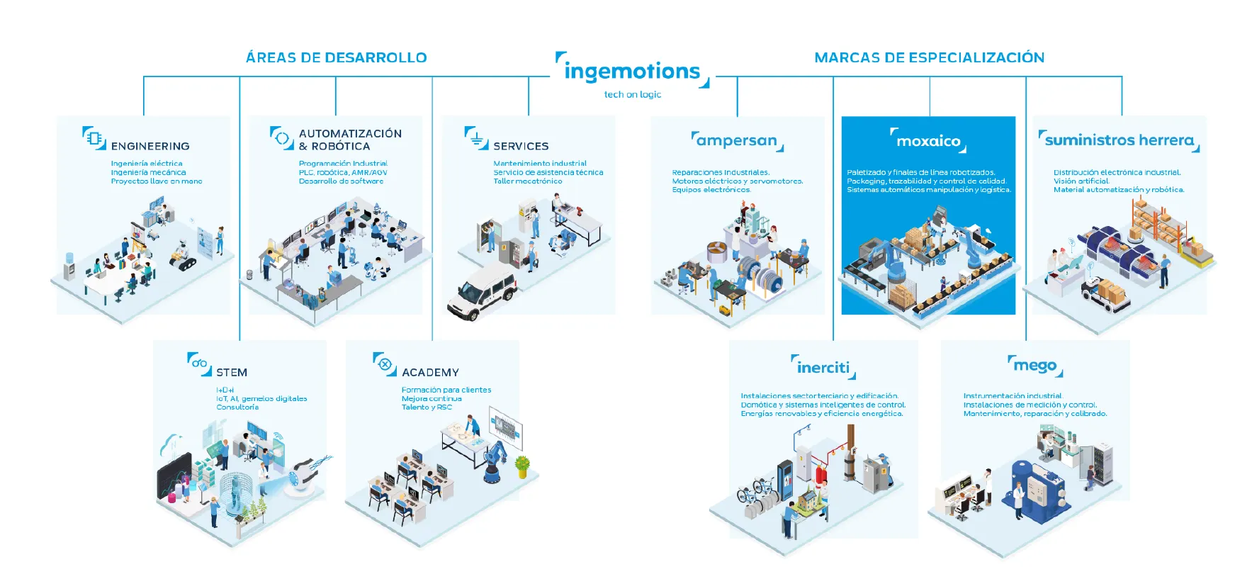 En Ingemotions no nos gusta estar parados. Nos gusta que todo se mueva de manera armoniosa y eficiente. Por eso en los últimos 15 años no hemos descansado realizando proyectos de automatización y líneas robotizadas en todos los sectores. Y a través de nuestra marca de especialización Moxaico aplicamos toda nuestra andadura y experiencia a los procesos automáticos de movimiento interno de material, empaquetado, manipulación de producto y paletizado.